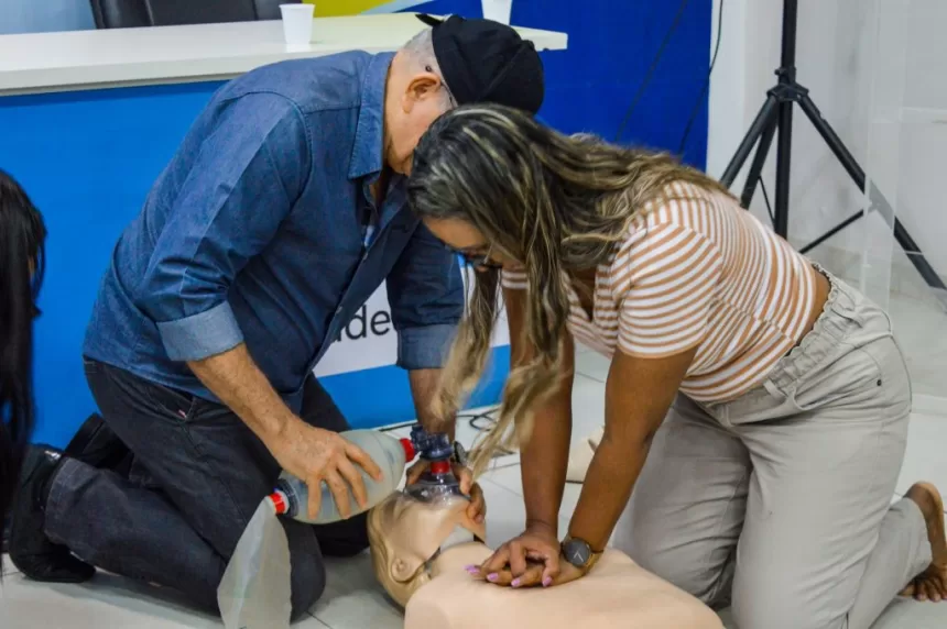 À tarde, a capacitação foi dedicada às práticas com foco no manejo de emergências: atendimento a vítimas em Parada Cardiorrespiratória (PCR), técnica correta de RCP de alta qualidade, manobra de desengasgo, reconhecimento precoce de sinais de gravidade, acionamento de emergência e segurança do cenário.