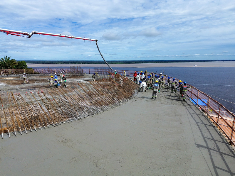 A Prefeitura de Manaus realiza a concretagem das vigas e lajes da oca do parque Encontro das Águas Rosa Almeida nesta sexta-feira, 13/2, no bairro Colônia Antônio Aleixo, zona Leste. Desde 7h e até o fim do dia, entrando pela noite, será usado um volume estimado em 380 metros cúbicos de concreto, o equivalente a 50 a 60 caminhões betoneira de uma única vez.