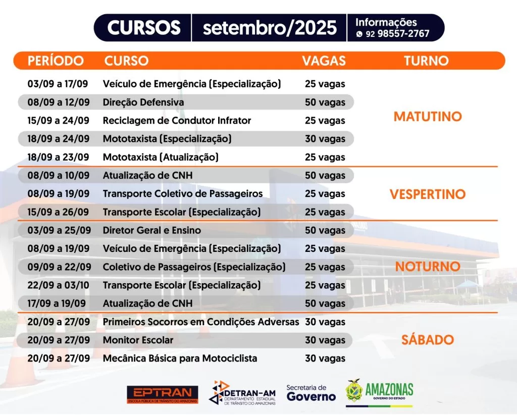 De acordo com o cronograma da Eptran, no turno matutino, o curso de Especialização para Condutor de Veículo de Emergência (25 vagas) inicia no dia 3 de setembro. O curso de Direção Defensiva (50 vagas) inicia no dia 8, e o curso de Reciclagem de Condutor Infrator (25 vagas), no dia 15. No dia 18 de setembro, também pela manhã, iniciam os cursos de Especialização para Mototaxista (30 vagas) e Atualização para Mototaxista (25 vagas).