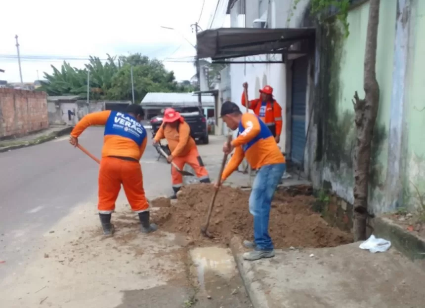 A Prefeitura de Manaus, por meio da Secretaria Municipal de infraestrutura (Seminf), intensificou neste sábado, 13/12, as frentes de trabalho na rua Heitor Galeão, no bairro Zumbi dos Palmares, zona Leste. As equipes executam um pacote completo de serviços para recuperar a drenagem superficial e profunda, atuando na limpeza de caixas coletoras, desobstrução de tubulações, substituição de trechos danificados e realinhamento da REDE para melhorar o escoamento das águas pluviais.