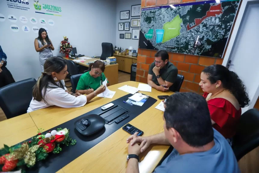 O secretário de Estado de Desenvolvimento Urbano e Metropolitano (Sedurb) e da Unidade Gestora de Projetos Especiais (UGPE), Marcellus Campêlo, assinou, na quarta-feira (03/12), o termo de compartilhamento do Escritório de Apoio Local (ELO) Cajual, localizado no bairro Santa Luzia, zona sul de Manaus, com a Associação dos Moradores do Bairro Morro da Liberdade (AMBML). A assinatura ocorreu na sede da UGPE, no Centro de Manaus, e definiu que o espaço do Prosamin+ será usado para o desenvolvimento de atividades e reuniões comunitárias.