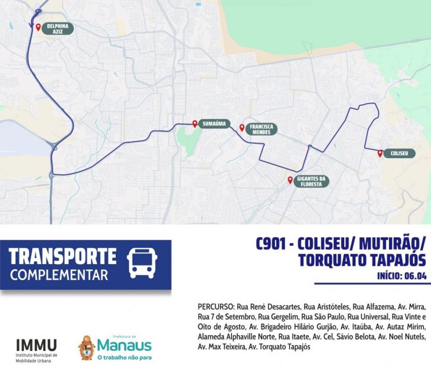 A partir desta segunda-feira, 6/4, a linha de ônibus C-901 (Coliseu/Mutirão/Torquato Tapajós) entra em operação na capital. A nova linha de ônibus liga a comunidade Coliseu, no bairro Jorge Teixeira, zona Leste, às imediações do bairro Tarumã, zona Oeste. A implementação foi definida pela Prefeitura de Manaus, por meio do Instituto Municipal de Mobilidade Urbana (IMMU), com base em levantamentos técnicos do órgão.