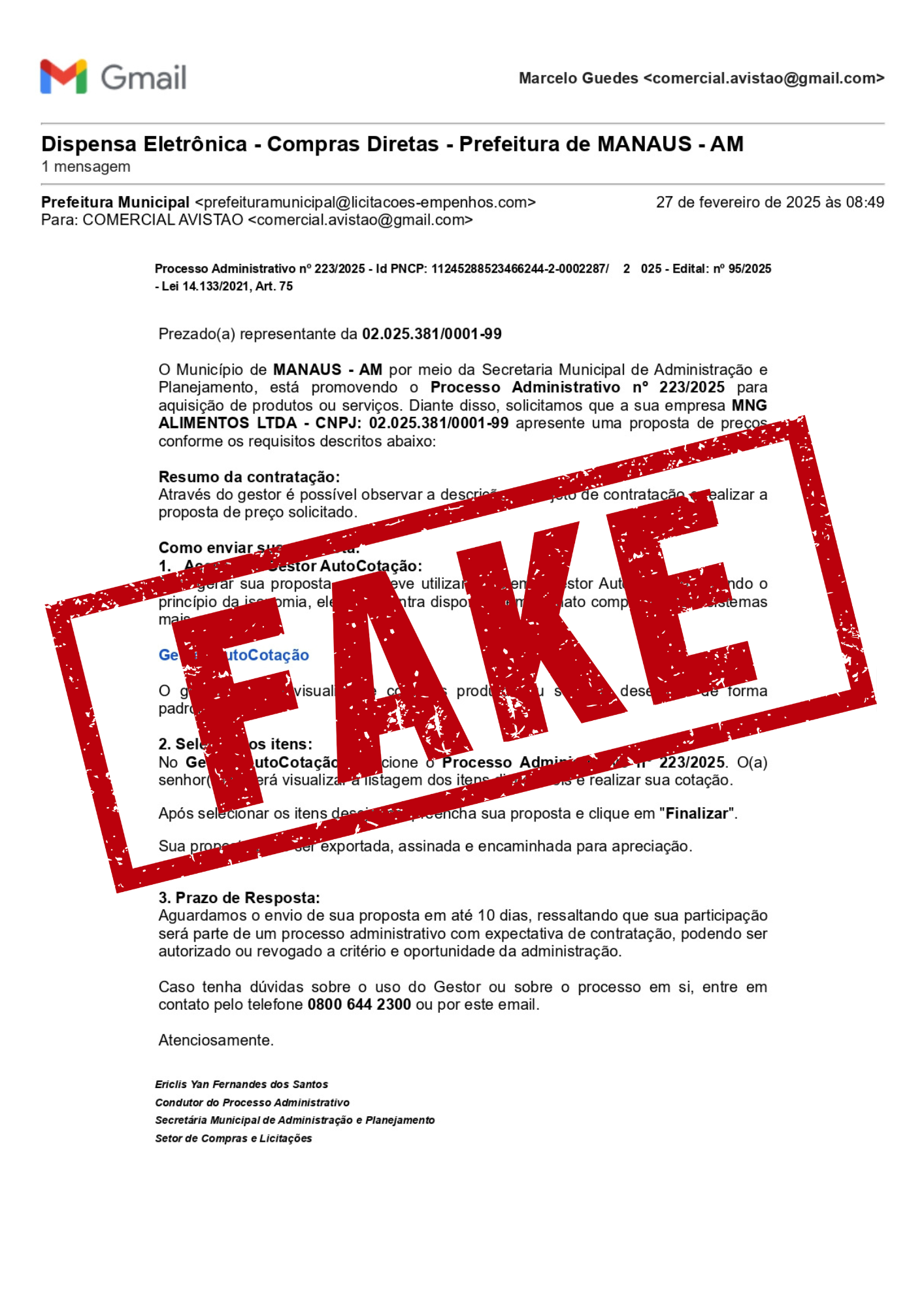 A prefeitura ressalta que o domínio oficial utilizado em suas correspondências é o manaus.am.gov.br e que não possui nenhum tipo de sistema Gestor de AutoCotação.