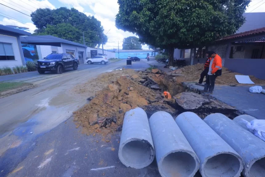 A Prefeitura de Manaus, por meio da Secretaria Municipal de infraestrutura (Seminf), executa, neste sábado, 13/12, a recuperação completa da drenagem profunda na rua Waldemar Pereira de Souza, no conjunto Belvedere, bairro Planalto, zona Centro-Oeste. Técnicos atuam no local após o aparecimento de uma cratera que apontou o rompimento de um trecho da tubulação, substituindo os tubos por manilhas com maior capacidade de vazão.