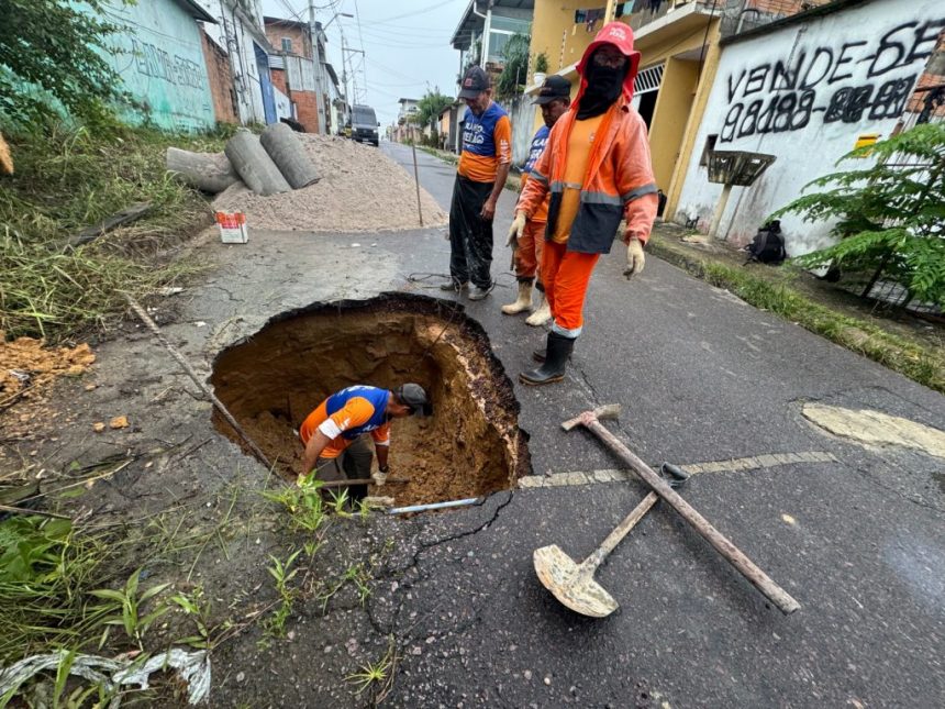 A Prefeitura de Manaus, por meio da Secretaria Municipal de infraestrutura (Seminf), intensificou, nesta segunda-feira, 23/2, os serviços de manutenção da REDE de drenagem profunda em diferentes pontos da capital. Um dos locais atendidos foi a rua Acácia do Nilo, no bairro NOVO Aleixo, zona Norte, onde a força das chuvas aliada ao descarte inadequado de resíduos provocou o desanelamento da tubulação e a abertura de uma cratera na via.