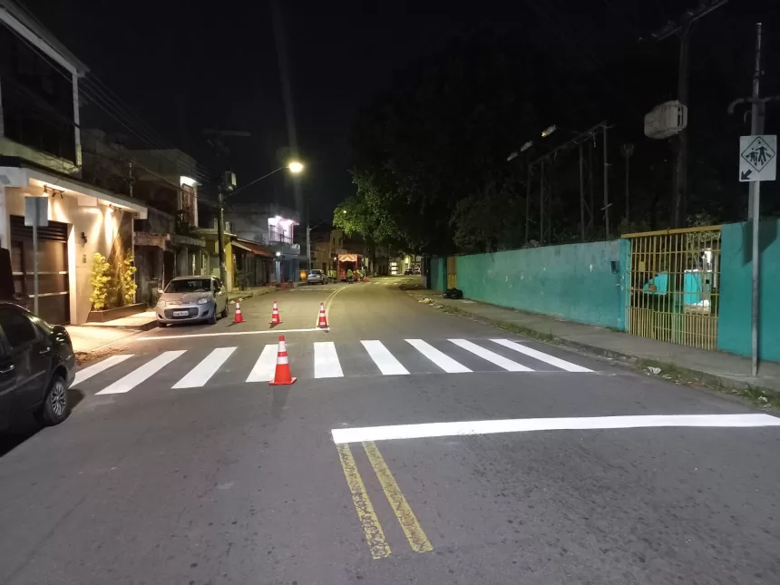 As equipes executaram pintura de faixas de pedestres, legendas “Pare”, linhas de retenção, linhas amarelas contínuas e seccionadas, além de pintura de bordo em trechos com proibição de estacionamento.