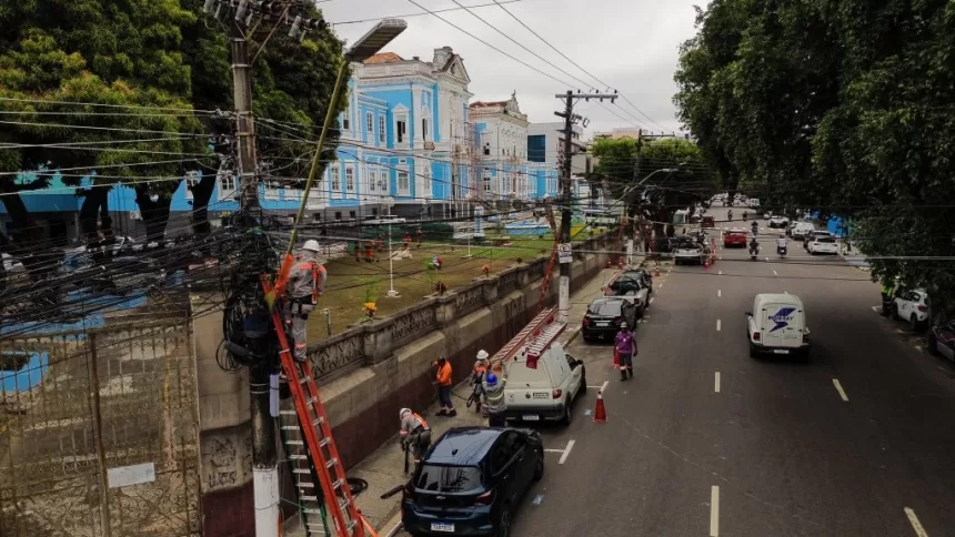 A Prefeitura de Manaus avança com as ações de revitalização urbana no centro histórico. Nesta quarta-feira, 5/11, equipes da operação de retirada de fios e cabos obsoletos voltaram às ruas, alcançando a marca de 7 toneladas de material removido de postes em oito vias da área.